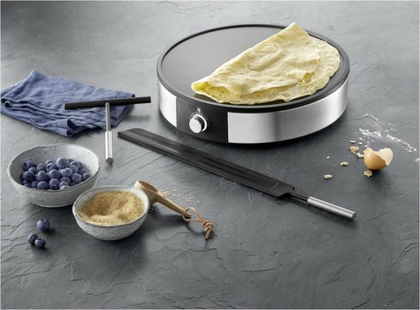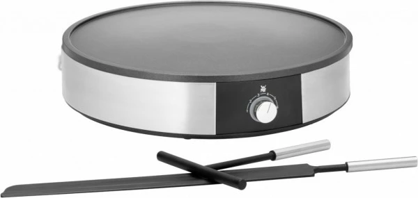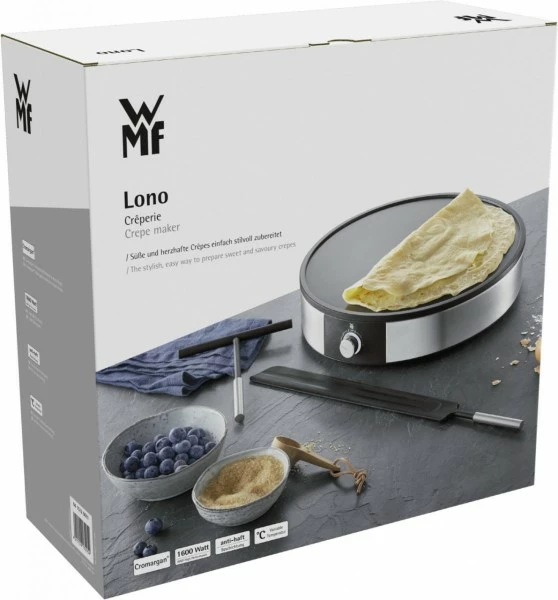 Mit seinem edlen Gehäuse aus Cromargan® macht die 1.500 Watt leistungsstarke WMF Lono Crêperie in jeder Hinsicht eine gute Figur: Für die präzise Zubereitung von süßen oder herzhaften Crêpes ganz nach individuellem Geschmack sorgt die variable Temperatureinstellung mit LED-Beleuchtung. Die großflächige, antihaftbeschichtete Crêpes-Platte mit Überflussrand lässt sich mühelos abnehmen und einfach in der Spülmaschine reinigen. Und die integrierte Kabelaufwicklung ermöglicht anschließend eine unkomplizierte Aufbewahrung. Inklusive umfangreichem Zubehör mit Teigverteiler und praktischem Crêpes-Wender, die ebenfalls spülmaschinengeeignet sind.