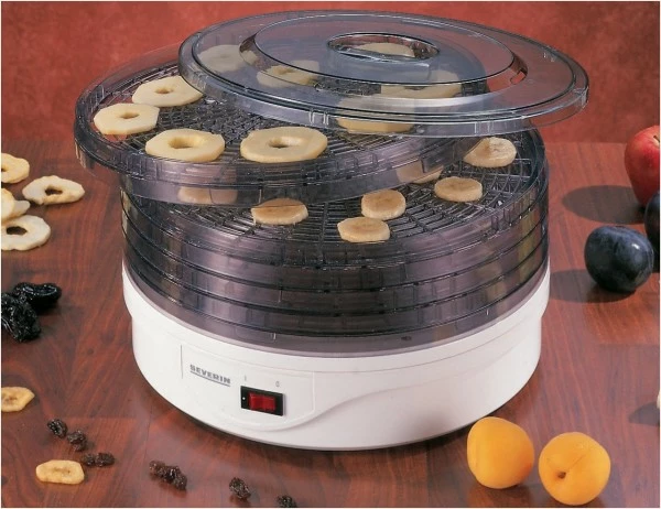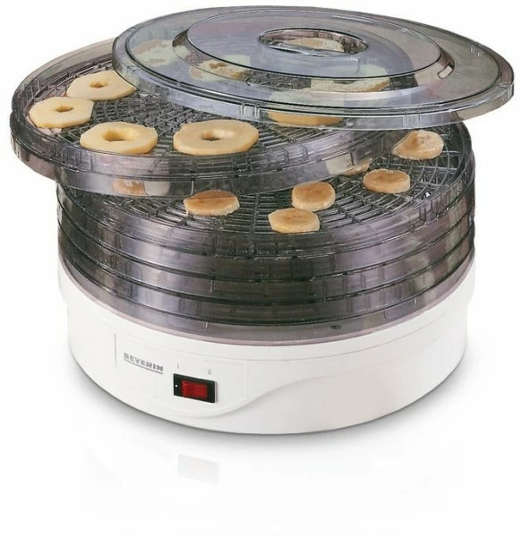Leistung: ca. 250 W, zum Trocknen von Früchten, Gemüse und Kräutern, 5 stapelbare Aufsätze, auch einzeln verwendbar, maximale Temperaturen: ca. 85 °C (unten), ca. 70 °C (oben), Kunststoffgehäuse, Aufsätze in zwei Höhen verstellbar, Motor mit Lüfterflügel, Ein-Aus-Schalter mit Kontrollleuchte, Klarsichtdeckel, große Dörrfläche, Ø der Aufsätze ca. 31 cm.